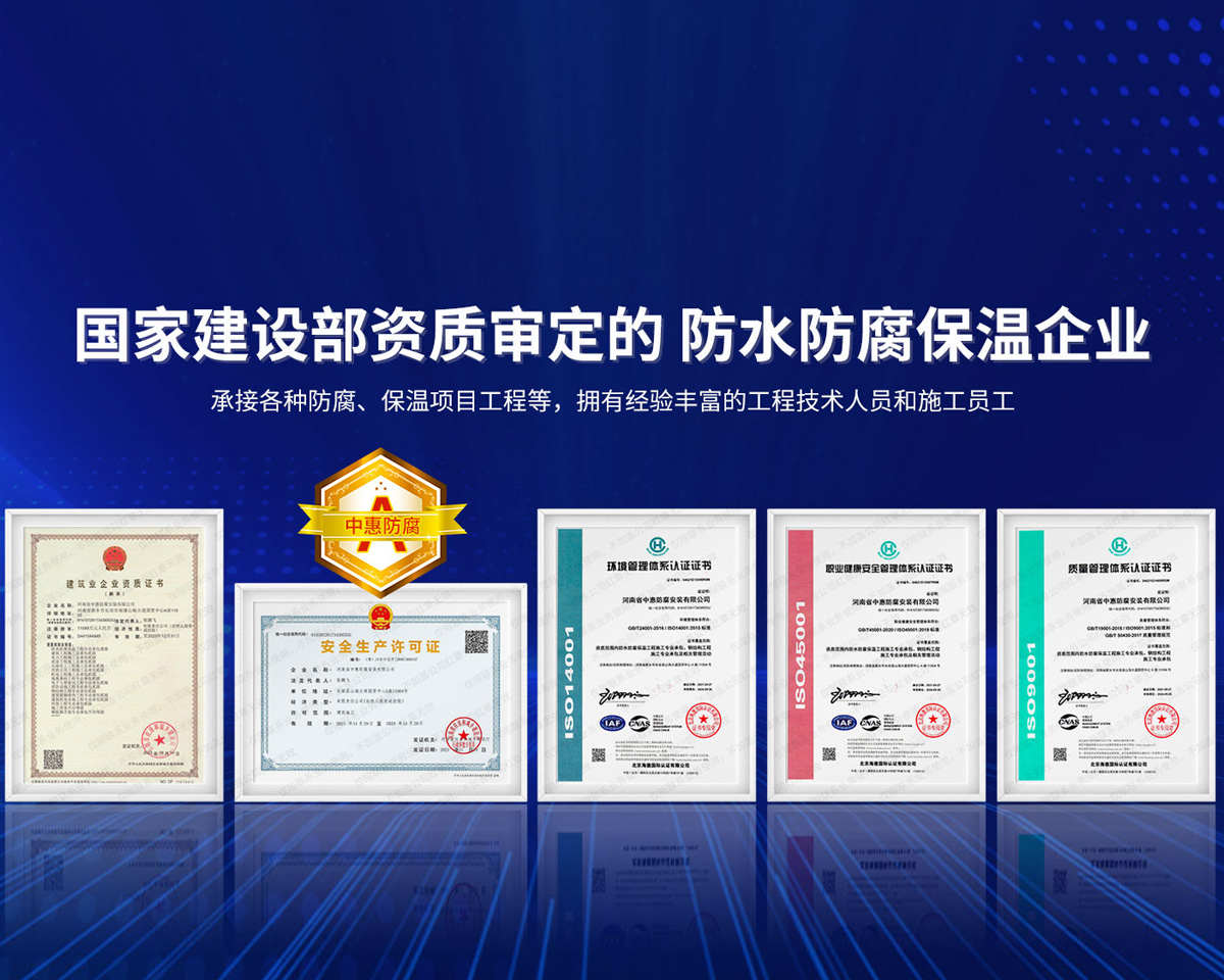 公司經營范圍:防水防腐保溫工程;消防設施工程;建筑裝修裝飾工程;建筑機電安裝工程;電力工程;建筑工程;石油化工工程;工業清洗工程;油罐清洗工程;鋼結構工程;環保工程;模板腳手架工程;電纜防火封堵、防污閃噴涂、外墻外保溫工程;各類施工勞務作業;設備維修、船舶鉚焊、涂裝;電力工程材料、建材、防水材料、防火材料、防腐保溫材料銷售,并相繼通過了GB/T19001-2008idtISO9001:2008GB/T50430-2007質量管理體系認證證書。GB/T24001-2004idtISO14001:2004環境管理體系認證證書。GB/T28001-2011idtOHSAS18001:2007職業健康安全管理體系認證證書。公司是中國防腐蝕于防護協會、中國施工企業管理協會、電力協會和中國鋼結構防水協會會員單位。 公司的經營業務涵蓋了石油、化工、電力、冶金、煤炭、船舶、國防、燃氣、水利、環保、交通運輸、航空及國防軍工和輕紡市政等行業的防腐保溫絕熱設備。鋼結構安裝、防火、防水、金屬噴鍍、聚脲噴繪、陰極保護、防滲透堵漏、玻璃鋼及各種磚版材料襯里、橡膠襯里、煙氣硫和耐酸溶劑腐蝕等工程施工。公司連續十年榮獲“省市先進施工企業”“安全生產先進單位”“重合同,守信用企業”和“AA***資質企業”的稱號。2000年被命名為市級文明單位,2002年被國家工商行政管理局命名為“重合同,守信用的企業”、被中國工業防腐蝕技術協會命名為“防腐蝕企業,能源節約及環境保護領域有豐富的經驗和***的業績。工程一次交驗合格率100%。其中攀枝花鋼鐵公司煉鐵廠四號高爐及熱風爐防腐工程、上海寶鋼公司煤氣柜防腐工程、撫順石油一廠裝置防腐項目、齊魯石化公司稀烴廠高塔防腐工程、吉林化學工業公司煉油廠油罐防腐工程、天津石化熱電廠六號爐頂棚聯絡管保溫工程、大慶油田(太倉)力神泵業工程、中國化學工程第十一建設工程、中原油田勘探局工程、中國石化銷售有限公司華北分部、魯皖輸油管道工程、貴州開磷息烽合成氨工程、陜西黃陵煤化工程、中國石油天然氣西部管道塔里木輸油工程、邯鋼集團邯寶鋼鐵公司煉鐵工程、德州供電工程、吉寶(南通)船廠工程,偃師華潤熱力工程、鄭州熱力總公司。 河南省中惠防腐安裝有限公司愿以豐富的施工經驗,***的技術,***的設備,***的管理,***的服務,竭誠為國內外廣大的用戶提供***滿意、******的工程作品。 我公司愿與國內外同仁一道,團結協作,共同推進防腐蝕行業發展! 公司地址:河南省長垣縣建設路北段360號 固定電話:0373-8866488 郵編:453400 網址:http://www_zhff_com_cn.zgdskfcypt.com